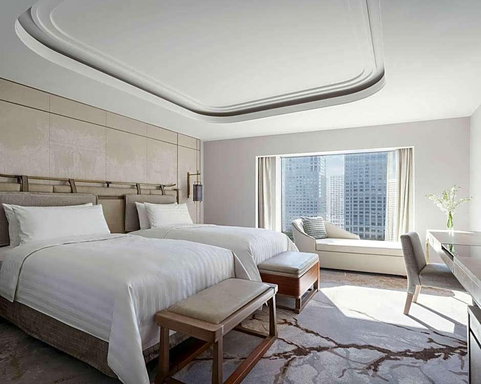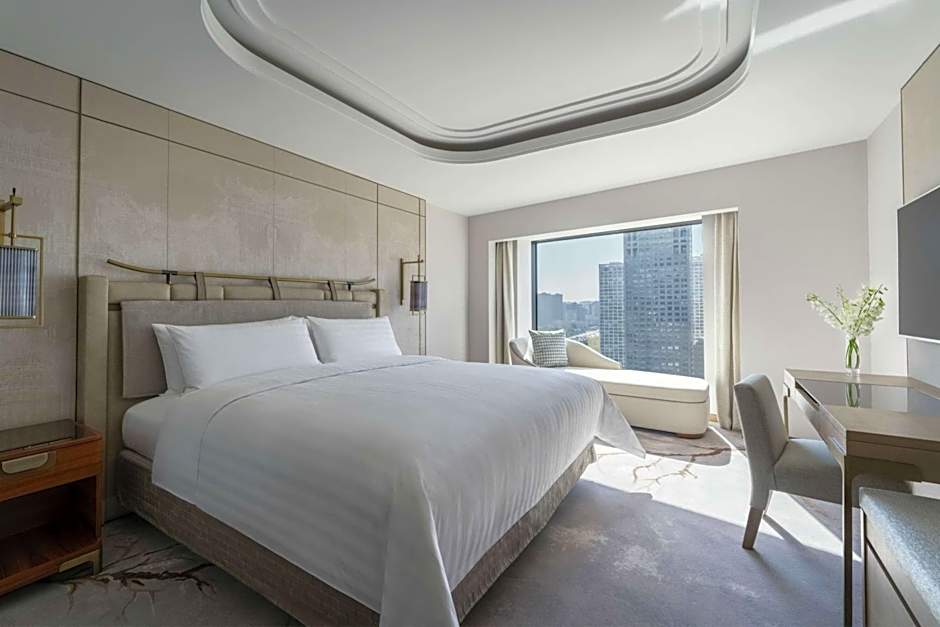 Decorated in a graceful Asian-influenced style, this spacious room features full-length windows overlooking the Beijing cityscape. It has a Herman Miller chair and DVD player.